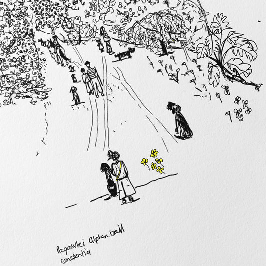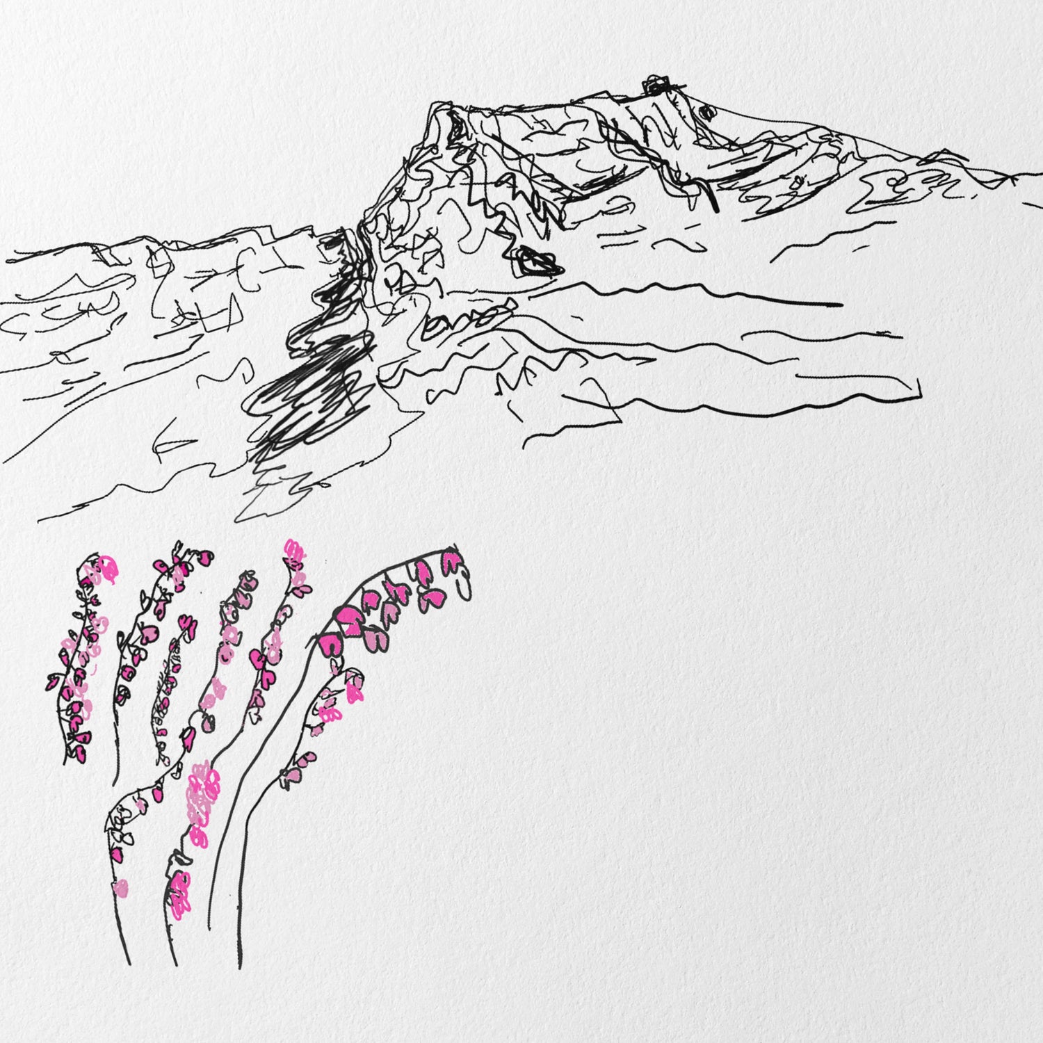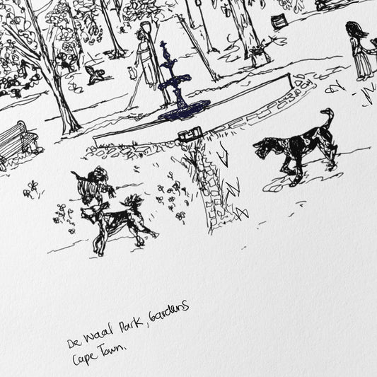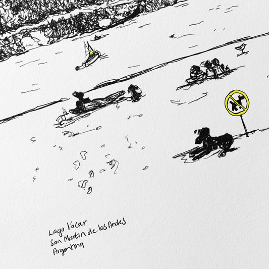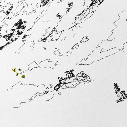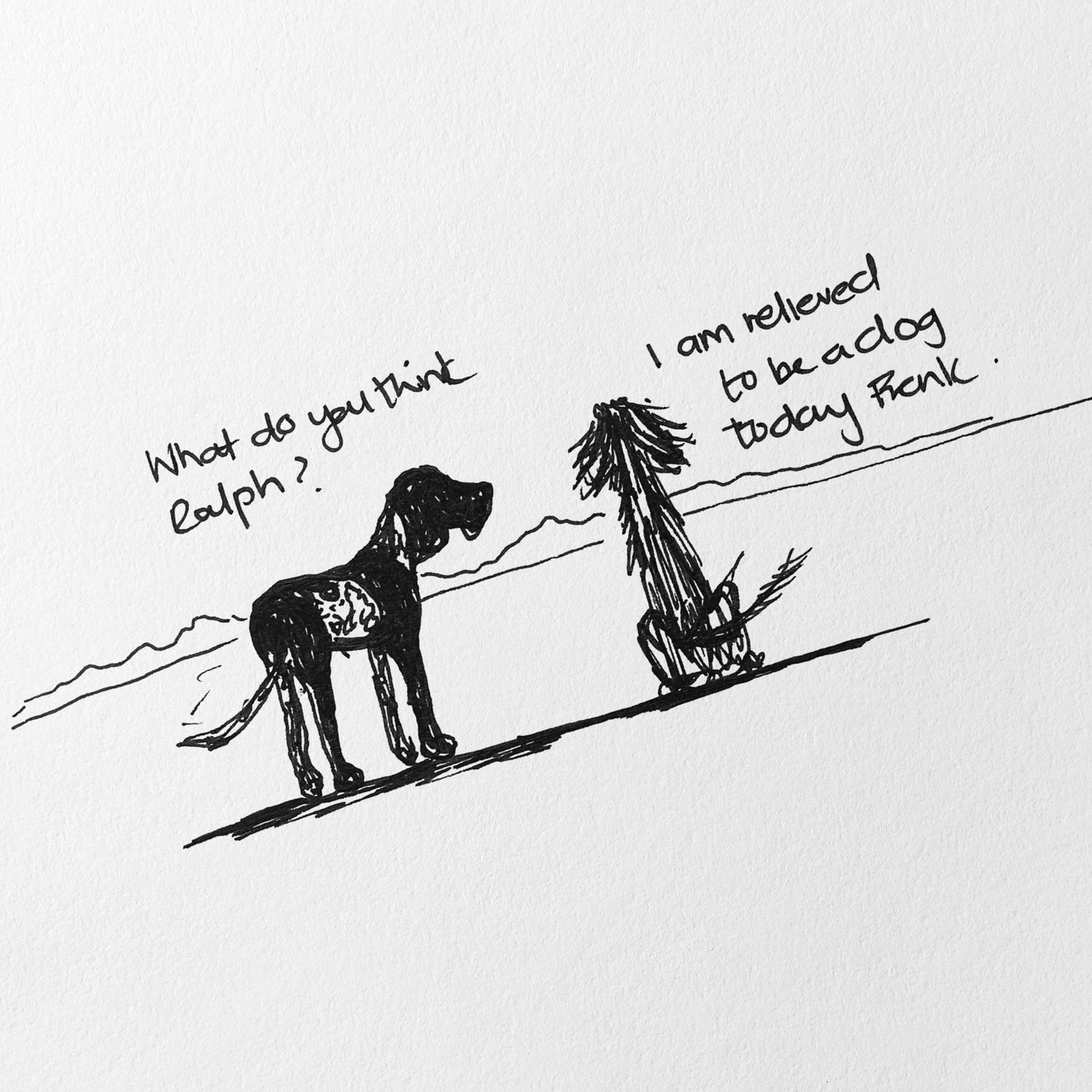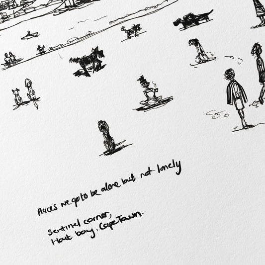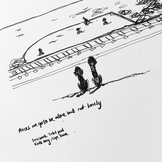 Alone, not lonely is a series of drawings I add to from time to time. Where I am in a place alone, but I don't feel lonely. I look around and see others who perhaps are feeling the same way. Whether it’s because of the natural space, the dogs around me or different people and characters. Whatever the case, there is a sense of humanity and oneness.